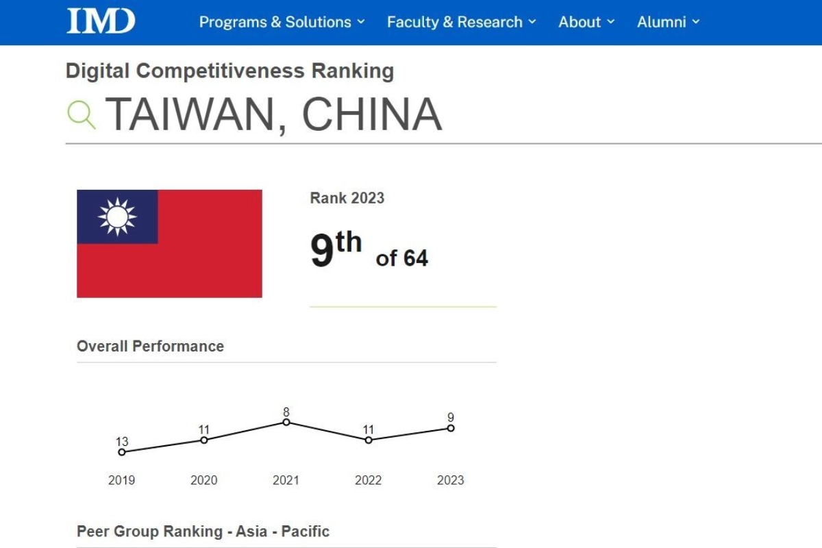 Theo bảng xếp hạng của Viện Phát triển Quản lý Quốc tế (IMD), năm 2023, Đài Loan đã đứng thứ 9 trong số 64 quốc gia được đánh giá cao về năng lực cạnh tranh kỹ thuật số, tăng hai bậc so với năm trước.