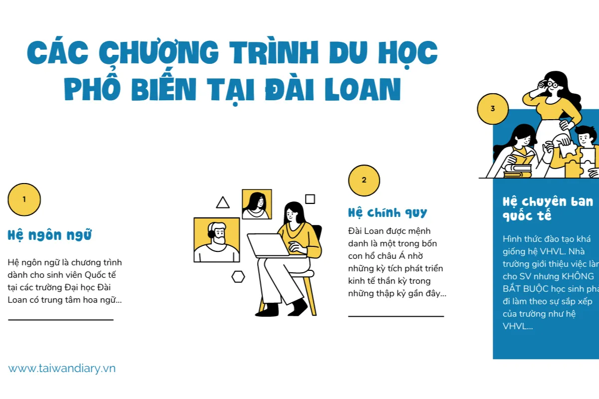 Trong thời đại toàn cầu hóa ngày nay, việc du học không chỉ là cơ hội mở ra một cánh cửa mới cho sự phát triển cá nhân, mà còn là cách hiệu quả để tận hưởng sự đa dạng văn hóa và nâng cao kiến thức chuyên môn. Trong danh sách các điểm đến du học ngày càng phong phú, Đài Loan đã nổi lên như một đất nước thu hút sự chú ý của sinh viên quốc tế. Với hệ thống giáo dục đa dạng, chất lượng cao, cùng với môi trường sống thoải mái và an toàn, Đài Loan đã trở thành điểm đến lý tưởng cho nhiều người muốn theo đuổi sự nghiệp học thuật và chuyên sâu.Trong bối cảnh này, việc tìm hiểu về các chương trình du học phổ biến tại Đài Loan không chỉ giúp sinh viên có cái nhìn tổng quan về sự đa dạng trong lĩnh vực học, mà còn mở ra những cơ hội học tập độc đáo và phát triển kỹ năng cho tương lai. Hãy cùng chúng tôi khám phá các chương trình du học độc đáo và hấp dẫn mà Đài Loan đang cung cấp, để bạn có thể chuẩn bị cho hành trình học tập đầy thách thức và ý nghĩa.