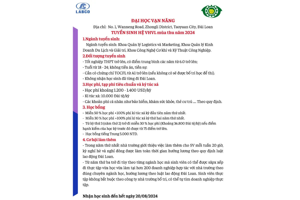 Qua bài viết sau đây, hãy cùng LABCO tìm hiểu học bổng hệ vừa học vừa làm Đại Học Vạn Năng kỳ thu 2024 nhé!