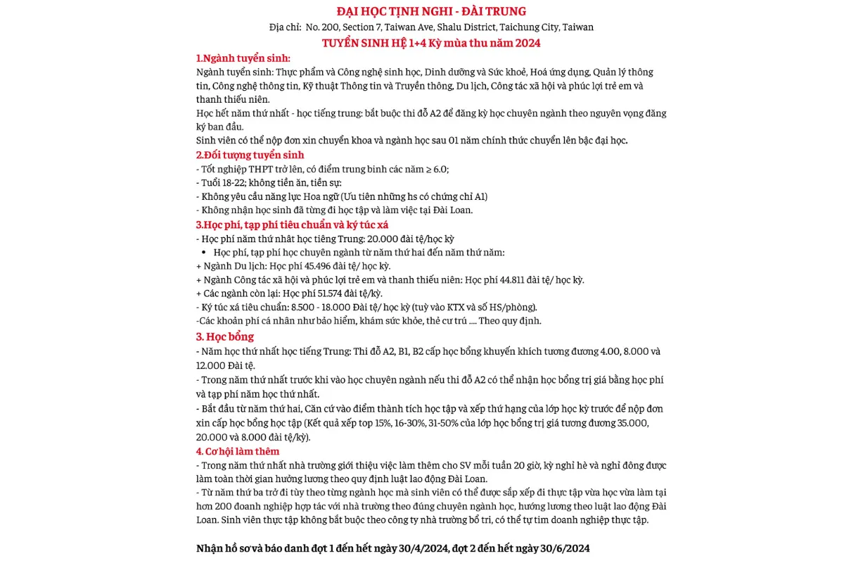 Sau đây, hãy cùng LABCO tìm hiểu thông tin tuyển sinh hệ 1+4 Đại học Tịnh Nghi – Đài Trung kỳ thu 2024 nhé!